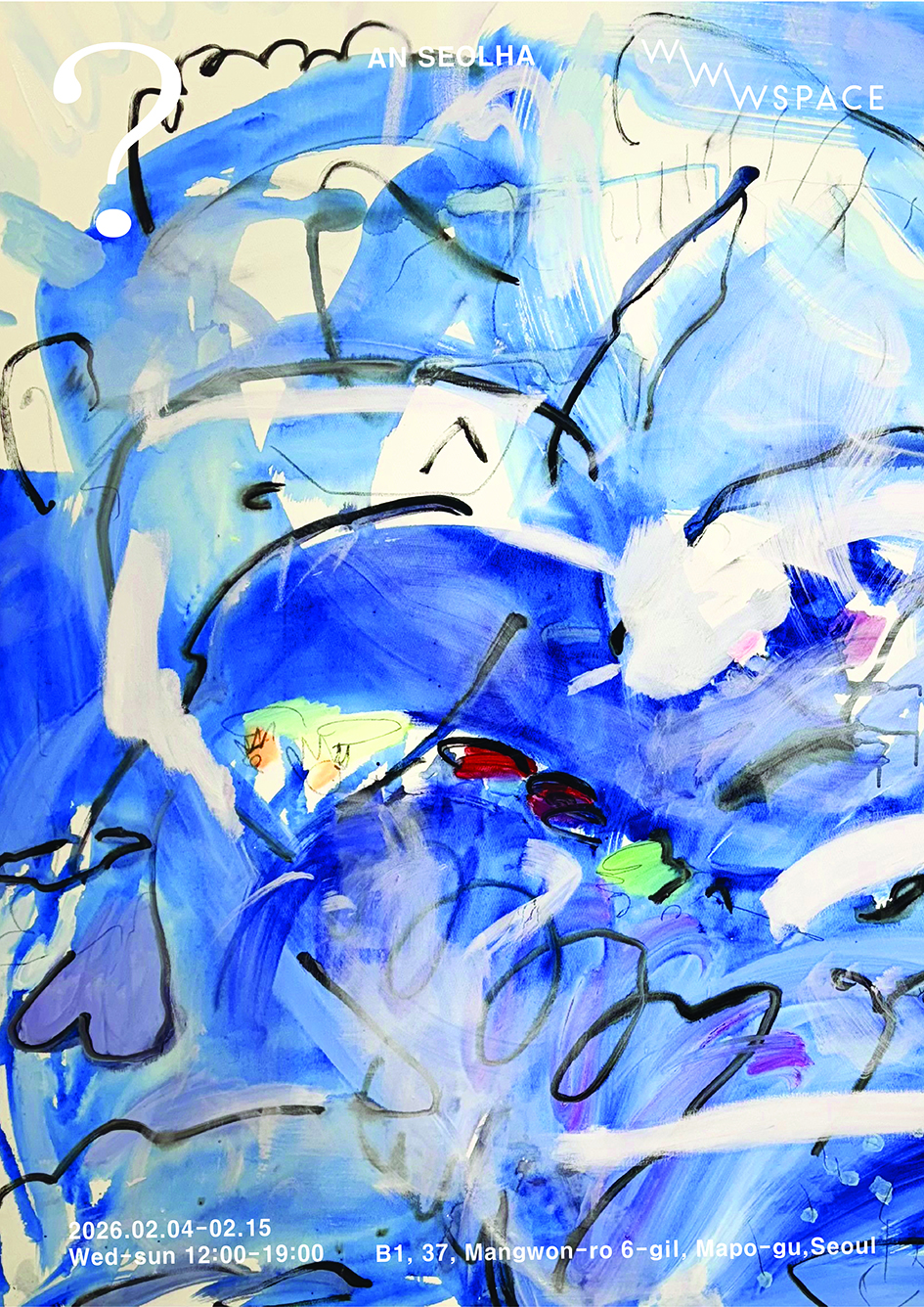 ? (Question Mark)익숙한 것을 낯설게 바라보고자 했다.보이는 대로 보지 않기 위해,내 눈을 다시 낳는 일부터 시작했다.사물은 이름을 가졌고,이름은 곧 그 쓰임을 뜻하지만 —나는 그것이 ‘되기 전’을 보고 싶었다.물병이 물병이기 전에,풍경이 풍경이기 전에,나 또한 '내가 아닌 어떤 것'이던 그 순간처럼.안설하?26.02.04 - 26.02.15Wed-Sun 12:00 - 19:00(Mon-Tues Closed)LAST DAY 26.02.15 12:00-16:00WWW SPACE 1서울특별시 마포구 망원로 6길 37, B1B1, 37, Mangwon-ro 6-gil, Mapo-gu, Seoul