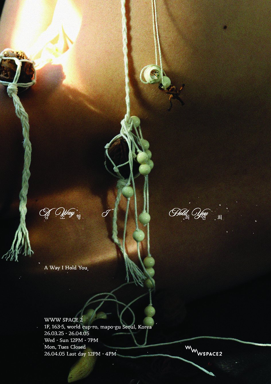 《A Way I Hold You》김소형은 우리가 중요하게 여기는 것이 대상 그 자체보다 그것을 바라보는 시선과 태도, 그리고 그것이 놓인 환경이라고 믿는다. 그에게 작업은 명확함을 증명하는 행위가 아니라, 명확하지 않음을 견디는 방식이다. 이 조각들은 고정된 확실한 존재라기보다 어떤 구체적인 양상에 더 가깝다.최연희는 이미 자리를 잡은 구조가 놓여 있는 방식을 통해 존재가 지속되는 과정을 관찰하고, 침묵속에서 변형된 복숭아씨를 곁에 두는 방법을 제시한다.-우리는 서로 다른 시점에서 b를 포착했고, 그를 다시 마주하고자 했다.그가 오기를 기다리기로 했다. 혹은 찾기로 했다. 이 전시는 그 기다림의 형식이며 어딘가 존재한다고 믿는 b가 이 곳을 통과할지는 알 수 없다.포스터: 조강빈 @chokangbin김소형, 최연희A Way I Hold You26.03.25 - 26.04.05Wed-Sun 12:00 - 19:00Mon,Tues ClosedLAST DAY 26.04.05 12:00-16:00WWW SPACE 2 @wwwspace21F, 163-5, World Cup-ro, Mapo-gu, Seoul:: wwwspace.kr2@gmail.comhttp://www.instagram.com/wwwspace2