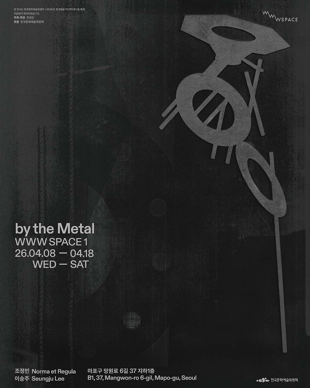 《by the Metal》 사라지는 소리를 붙잡는 것은 가능한가. 소리는 시간의 흐름에 따라 필연적으로 사라진다.음악이 다른 예술 분야와 구별되는 가장 큰 특징은 소리가 가진 본질적인 ‘시간성’에 있다.프로젝트 《by the Metal》은 음악이 가진 이 필연적인 ‘시간성’에서 출발한다. 이 작업에서 스피커는 단순히 소리를 출력하는 장치를 넘어, 진동을 촉발하는 매개이자 또 하나의 악기로 기능한다.스피커의 떨림은 주변 금속 물체로 전달되고, 금속 물체 간의 충돌은 다시 새로운 소리를 파생시킨다. 하나의 소리가 또 다른 소리를 만들어내는 것이다. 본 프로젝트는 이러한 연쇄적인 구조에 주목한다. 이 과정 속에서 찰나의 순간은 연속적인 흐름으로 이어진다. 26.04.12 16:00-16:40라이브 퍼포먼스만 진행합니다. 영상 :김승원프로젝트 매니지먼트 : 정시율후원 : 한국문화예술위원회 by the Metal조정민, 이승주26.04.08- 26.04.18Wed-Sun 12:00-19:00Mon,Tues ClosedWWW SPACE 1 @www__spaceB1, 37, Mangwon-ro 6-gil, Mapo-gu, Seoul:: wwwspace.kr@gmail.comhttp://www.instagram.com/www__space